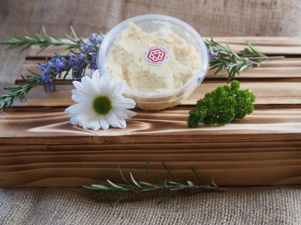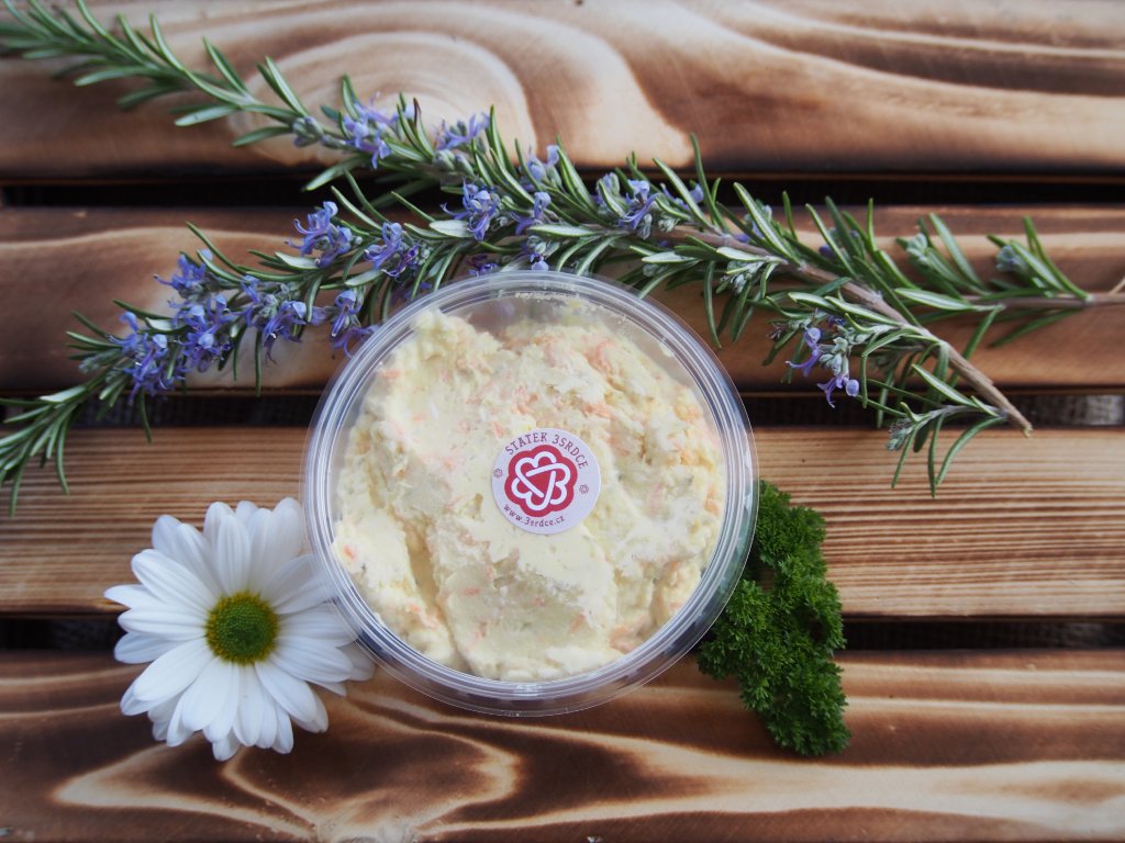 Pomazánka z plnotučného tvarohu ze statku, vejce, mrkev, okurky. Obsah 150g. Trvanlivost 8 dní.